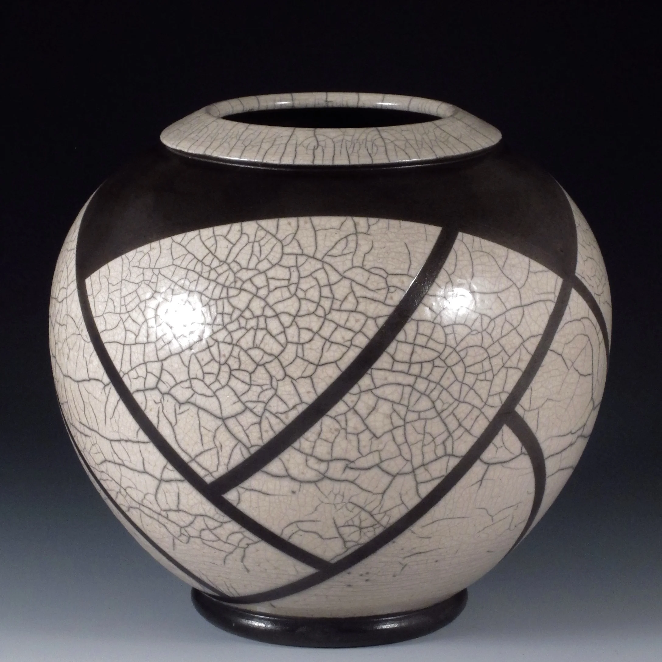 The white crackle Raku firing process involves painting a clear glaze on a bisqued ceramic form and placing the individual pot in an outdoor propane kiln for firing. Once the kiln temperature reaches 1850 degrees and the glaze matures the pot is removed hot from the kiln and allowed to cool rapidly causing surface cracks in the glaze.